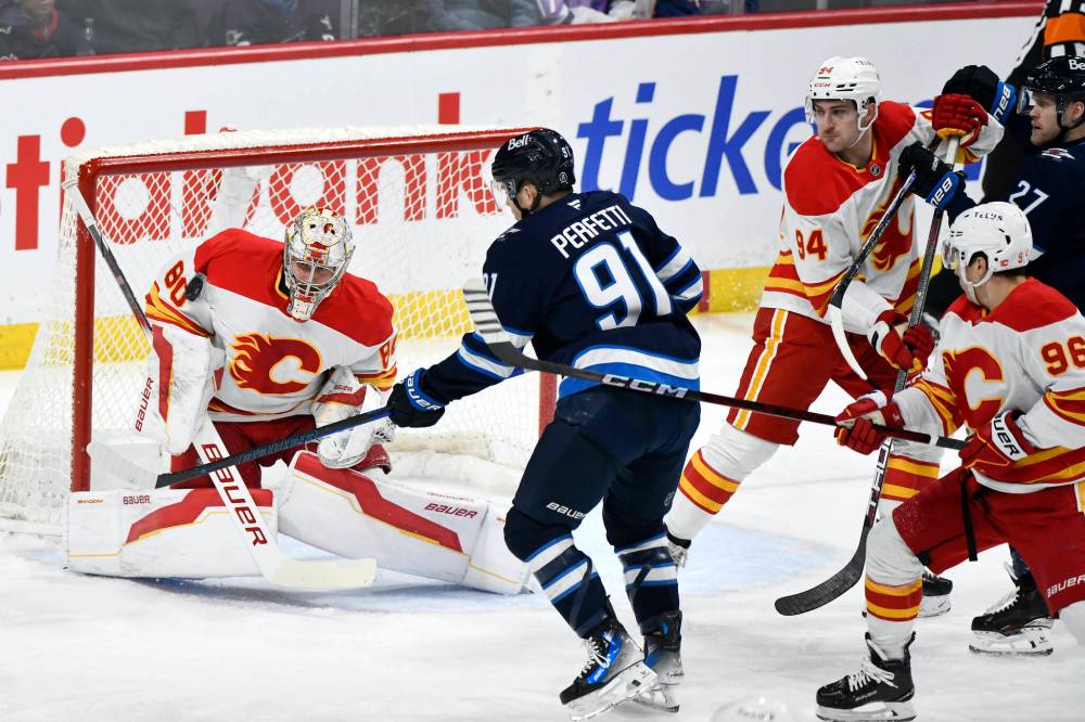 Calgary Flames’ goaltender Dan Vladar makes a save on Winnipeg Jets’ Cole Perfetti (91) during the first period on Sunday.