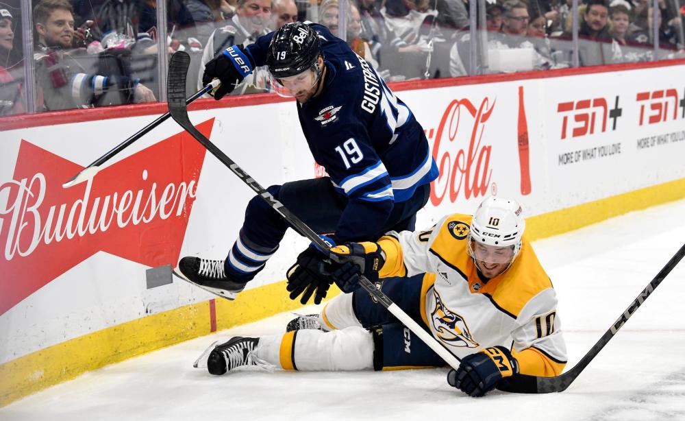 Fred Greenslade / THE CANADIAN PRESS FILES Centre David Gustafsson, top, has a three-game point streak while helping fill the void left by injured Jets' captain Adam Lowry.