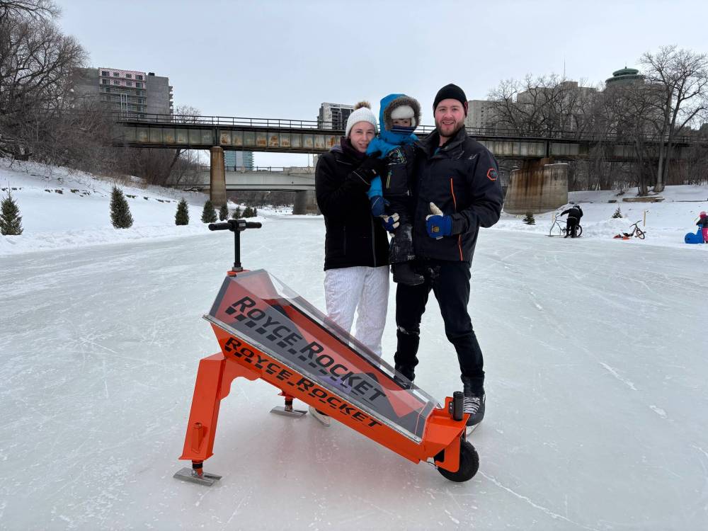 The motorized vehicle, which Keegan made himself, is mounted on two blades and a wheel. It features a plastic shield so that Seth is protected from the wind as the Royces make their way up and down the six-kilometre trail.