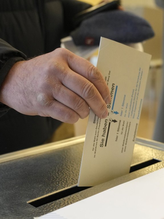 A resident casts a vote at a polling station in Berlin, Germany, Sunday, Feb. 23, 2025, during the German national election. (AP Photo/Markus Schreiber)