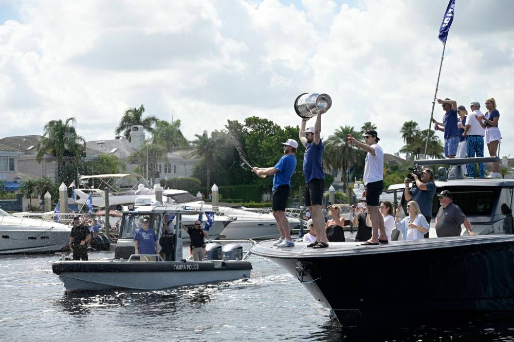 Tampa Bay Lightning center Steven Stamkos, left, and defenseman Luke Schenn, right, celebrate as defenceman Victor Hedman hoists the Stanley Cup during the NHL hockey Stanley Cup champions’ Boat Parade, Monday, July 12, 2021, in Tampa, Fla. (Phelan M. Ebenhack/The Associated Press files)