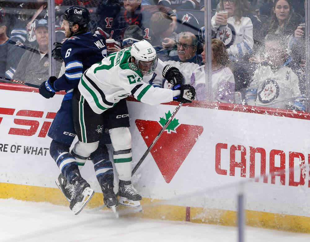 John Woods / THE CANADIAN PRESS The Jets’ Colin Miller and Stars’ Mason Marchment collide during the first period.