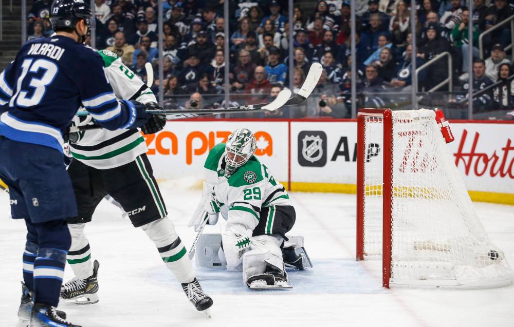 John Woods / THE CANADIAN PRESS Kyle Connor’s second-period shot finds the back of the net behind Dallas goaltender Jake Oettinger as Gabriel Vilardi makes trouble in front of the Stars’ net.
