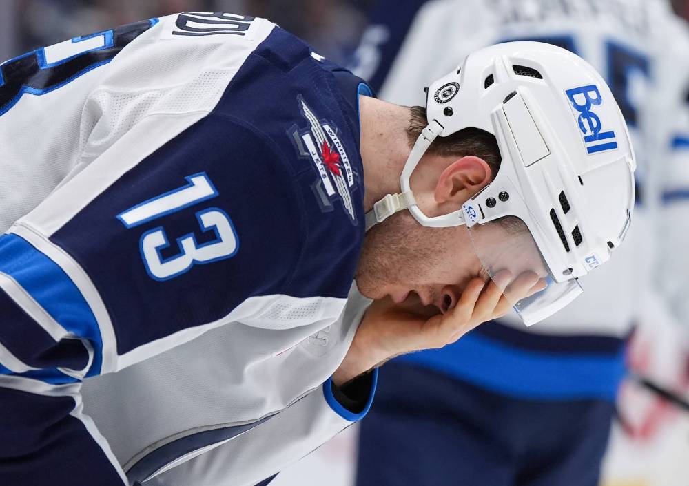 Winnipeg Jets’ Gabriel Vilardi grimaces after taking a high stick to the face from Vancouver Canucks’ Filip Hronek, during the second period.