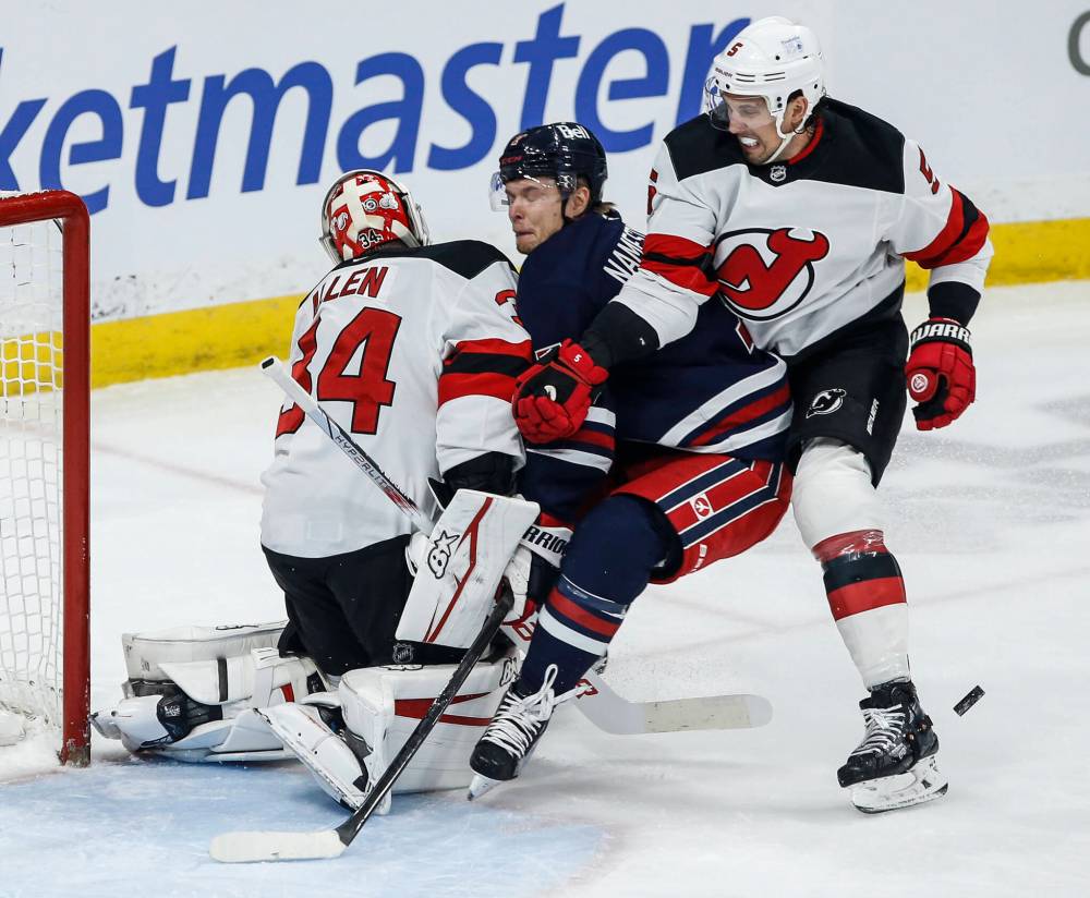 Jets forward Vlad Namestnikov had a nice rush which ended with him bowling over Allen and getting penalized in the first period. Devils defenceman Brenden Dillon was on the scene but showed some restraint — perhaps due to the fact Namestnikov had been his Winnipeg teammate for two years.