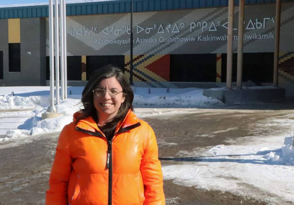Brett Nicholls / Free Press NDP candidate Niki Ashton in front of Nisichawayasihk Neyo Ohtinwak Collegiate.