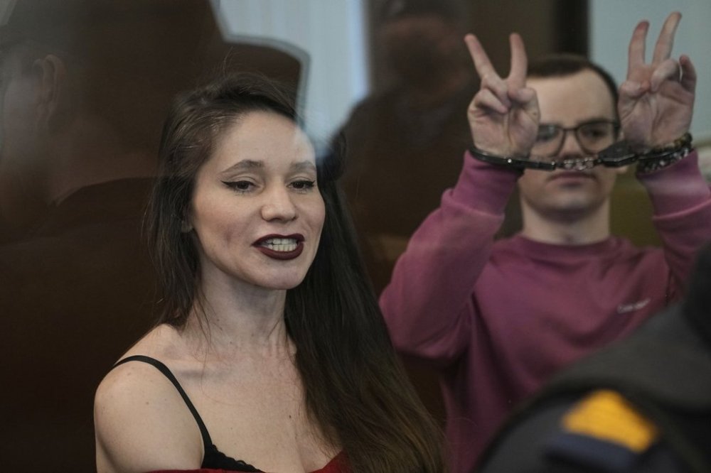 Russian journalists, Antonina Favorskaya, left, and Artyom Kriger, accused of working for a group founded by the late Russian opposition politician Alexei Navalny, stand in a defendant's cage of the Nagatinsky District Court in Moscow, Russia, on Tuesday, April 15, 2025. (AP Photo)