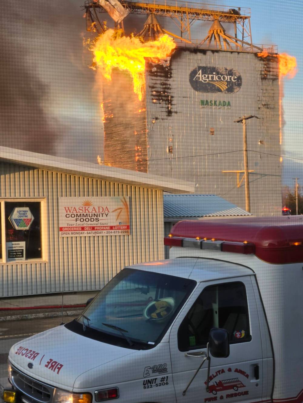 A former Agricore grain elevator in Waskada went up in flames early Tuesday. (Supplied)