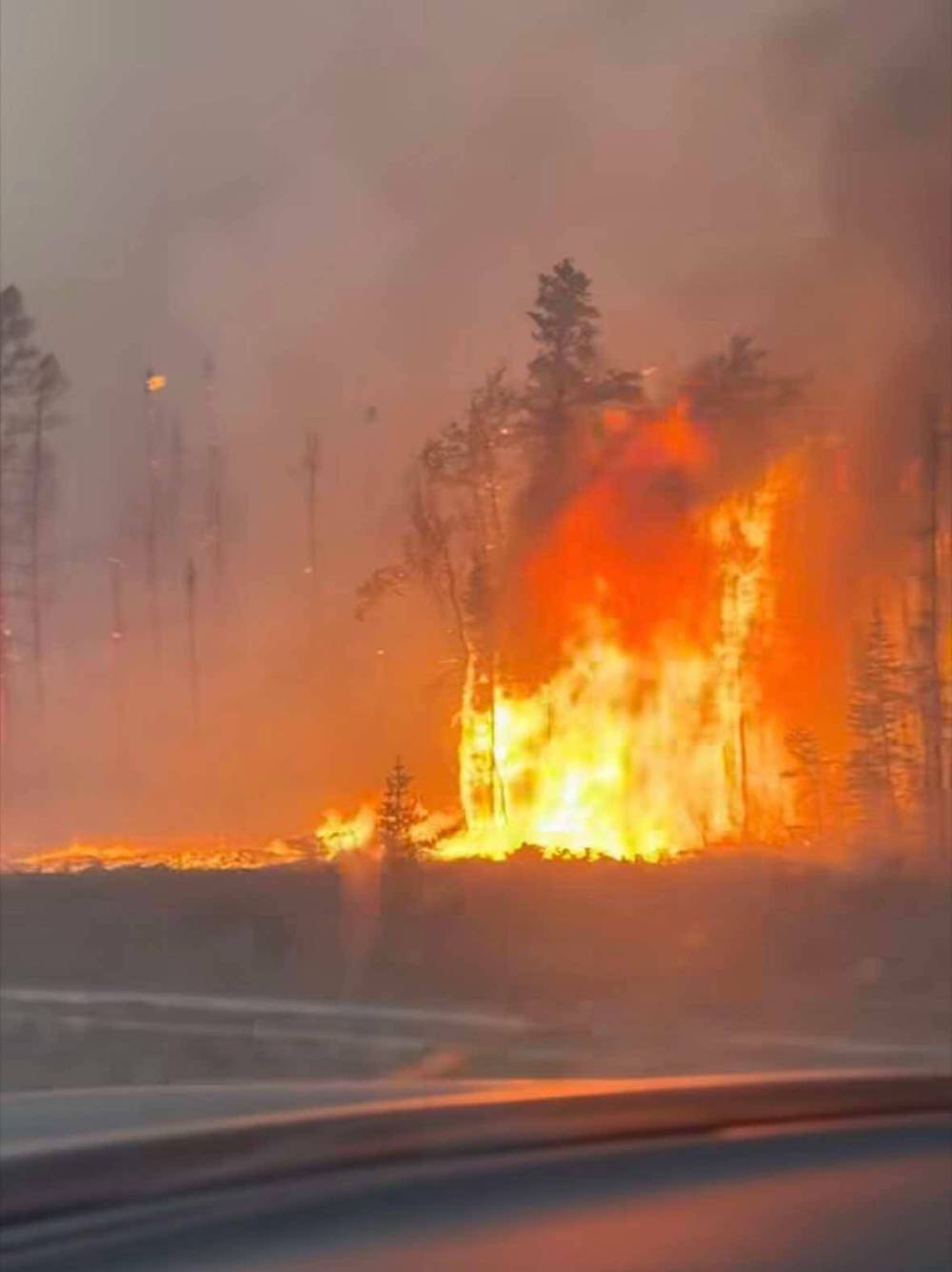 Video provided by McIntyre showed a wall of flames in a forested area, while dense smoke shrouded Provincial Road 287. Her son encouraged her to keep going as they drove past the blaze.