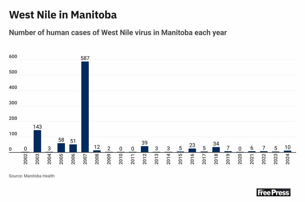 Manitoba has recorded fewer than 10 human infections in each year since 2018, when cases spiked to 34. The historic high for provincial infections reached 587 in 2007, the data shows.