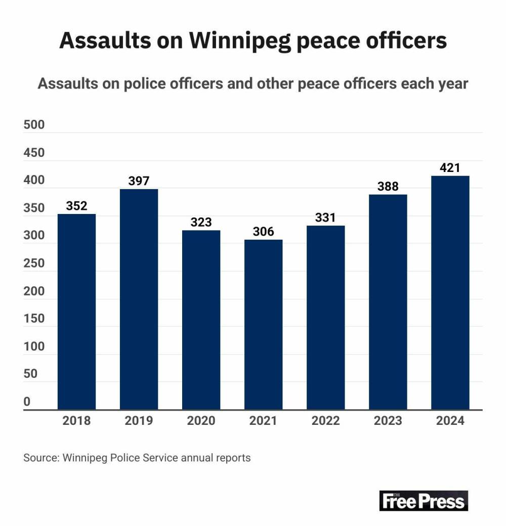 A new Winnipeg Police Service statistical report said 421 assaults against peace officers were recorded in 2024, up from 388 in 2023.