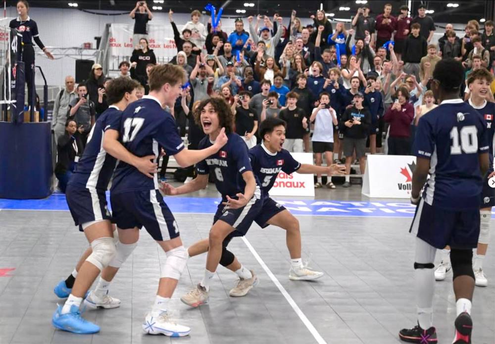 The WinMan 15U boys team celebrates their gold medal win over the Ontario Provincial Champions and #1 seeded team, Pakmen Gold, in straight sets in Edmonton.