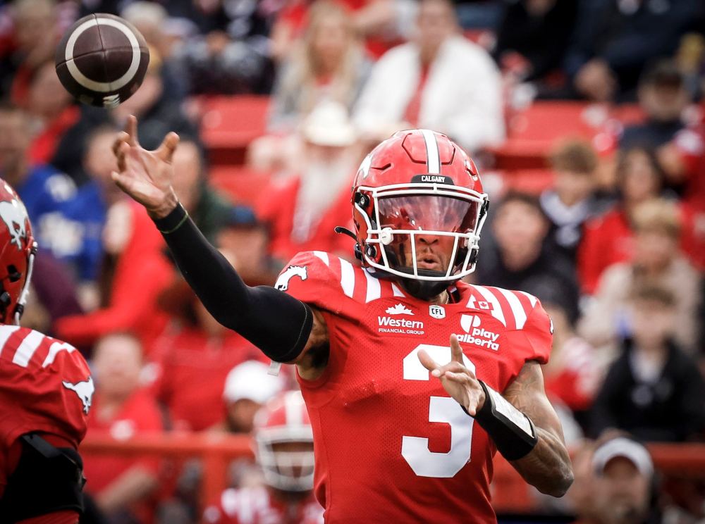 Calgary Stampeders quarterback Vernon Adams Jr. completed 13-of-18 passes for 222 yards and two touchdowns against the Bombers, Thursday.