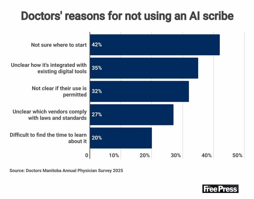 Doctors Manitoba’s 2025 workforce survey found only six per cent of members were actively using an AI scribe as of February.