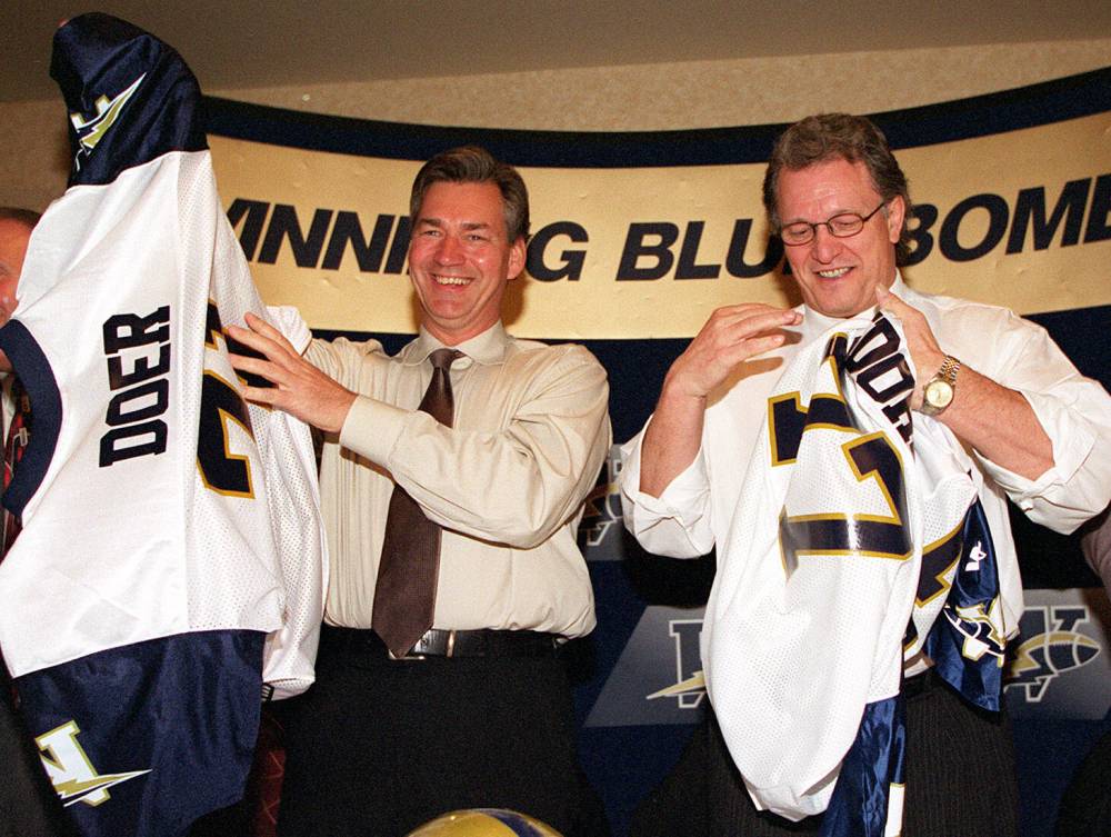 JOE BRYKSA / FREE PRESS FILES In 2001, Premier Gary Doer and Canad Inns President Leo Ledohowski try on Bomber jerseys at a news conference announcing the Winnipeg Stadium would be renamed the Canad Inns Stadium.