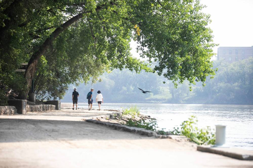 Smoke hangs over the Red River as people walk the River Trail at The Forks on Thursday.