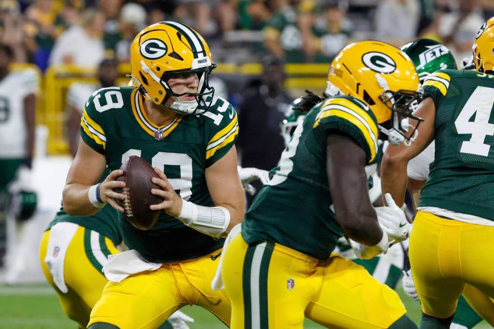 MIKE ROEMER / THE ASSOCIATED PRESS Winnipeg Blue Bombers second-round draft pick Taylor Elgersma (left) got his first taste of NFL action Saturday as the Green Bay Packers’ late-game pre-season pivot. Elgersma is the first Canadian university quarterback to play in an exhibition game since the early 1980s.