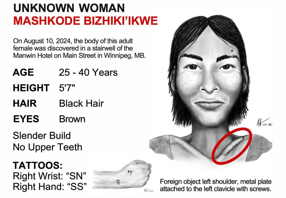 Winnipeg police released an updated sketch of Mashkode Bizhiki’ikwe, a woman who was found dead in the Manwin Hotel a year ago. Mashkode Bizhiki’ikwe is described as anywhere from 25 to 40 years old, Indigenous with shoulder-length dark hair and brown eyes. She had no remaining upper teeth, but her lower teeth were all intact. She had a papiloma above her left eyebrow and a small tattoo reading “SN” on her right wrist and “SS” on the back of her right hand.