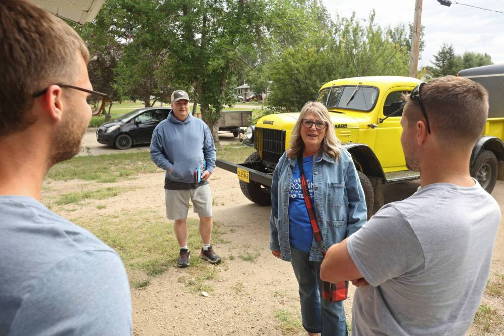 Manitoba Progressive Conservative candidate Colleen Robbins, along with volunteer Duncan Hamilton, chat with Brett Foster, and his brother-in-law Alex Curle, at Foster’s home on Charles Avenue in Spruce Woods while out door knocking and meeting voters on Friday ahead of Tuesday’s Spruce Woods byelection.