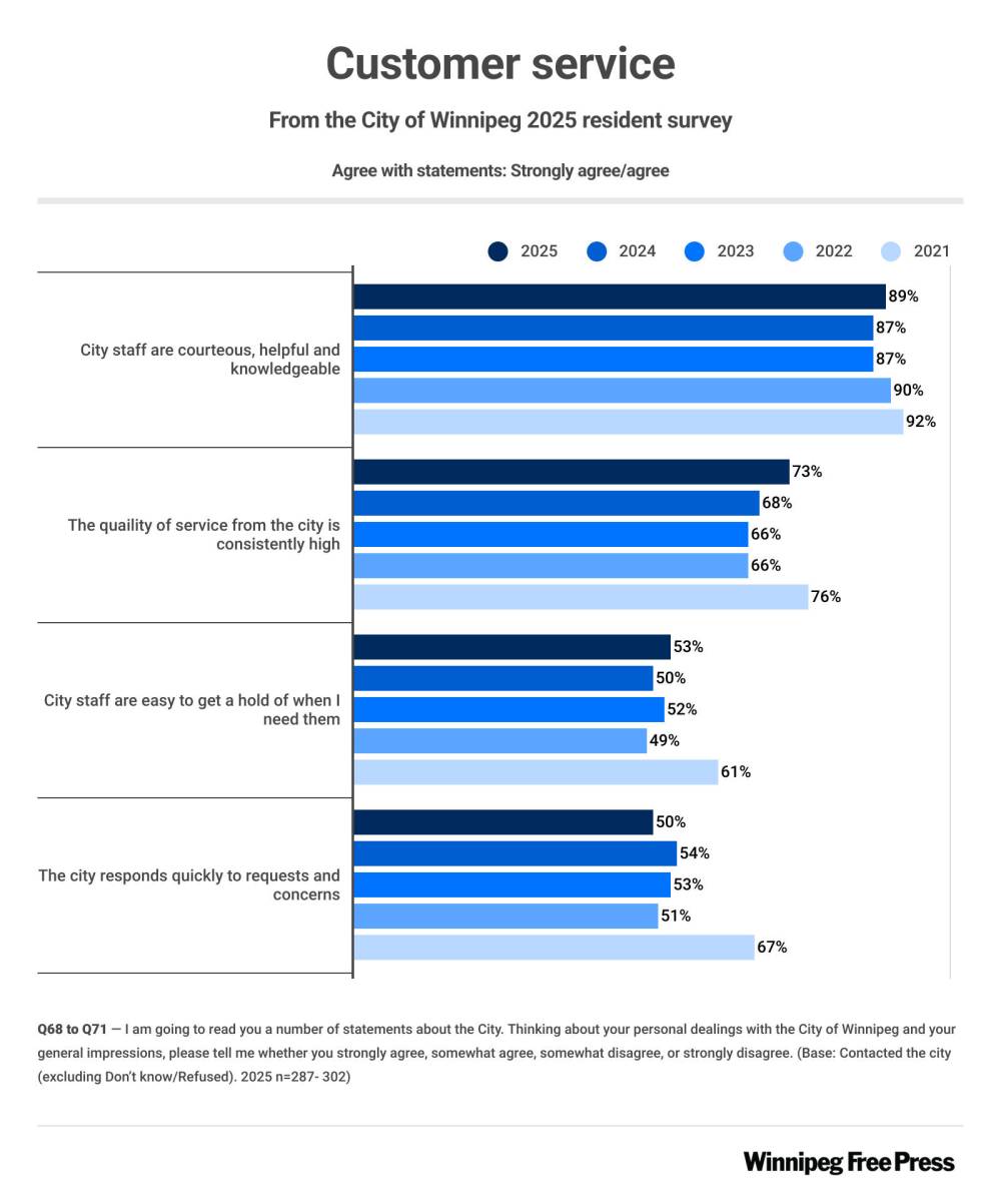 Meanwhile, Winnipeggers had mixed views on the city’s level of customer service. Just 53 per cent strongly or somewhat agreed city staff are easy to get a hold of when needed and only 50 per cent strongly or somewhat agreed the city “responds quickly to requests and concerns.”