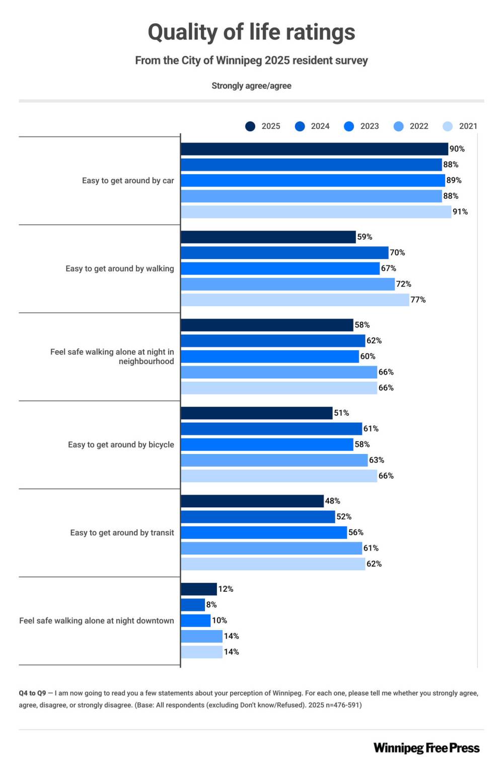 The City of Winnipeg’s 2025 Resident Satisfaction Survey discovered a large majority of residents (90 per cent) agreed or strongly agreed it is easy to get around the city by car, which dropped to 59 per cent for walking, 51 per cent for cycling and 48 per cent for transit.