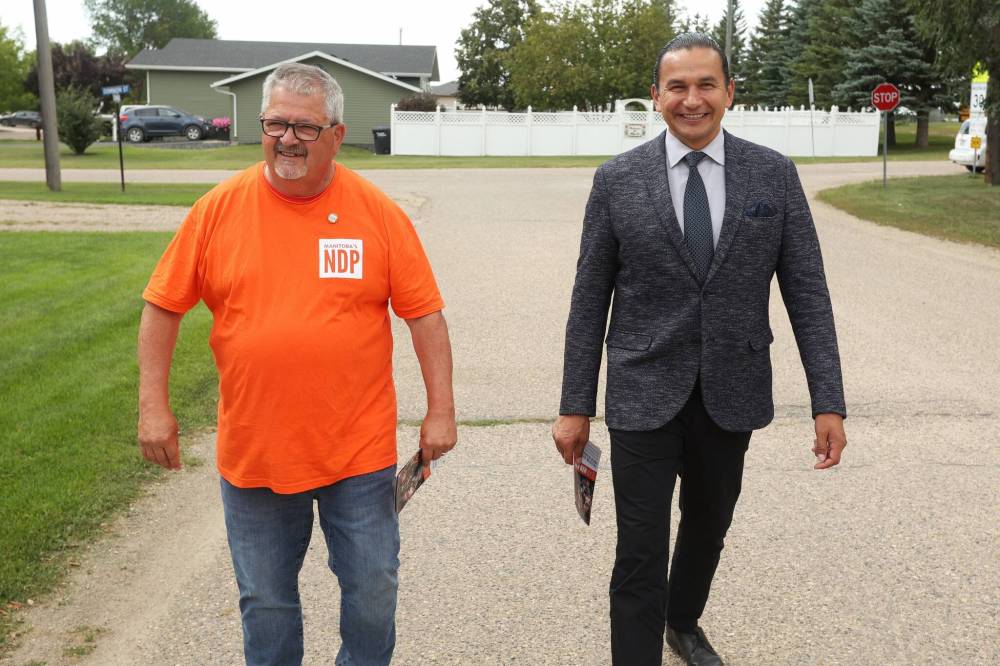 Spruce Woods NDP candidate Ray Berthelette and Manitoba Premier Wab Kinew walk together in Rivers to knock on doors and meet voters on Monday in the final push ahead of today’s Spruce Woods byelection.
