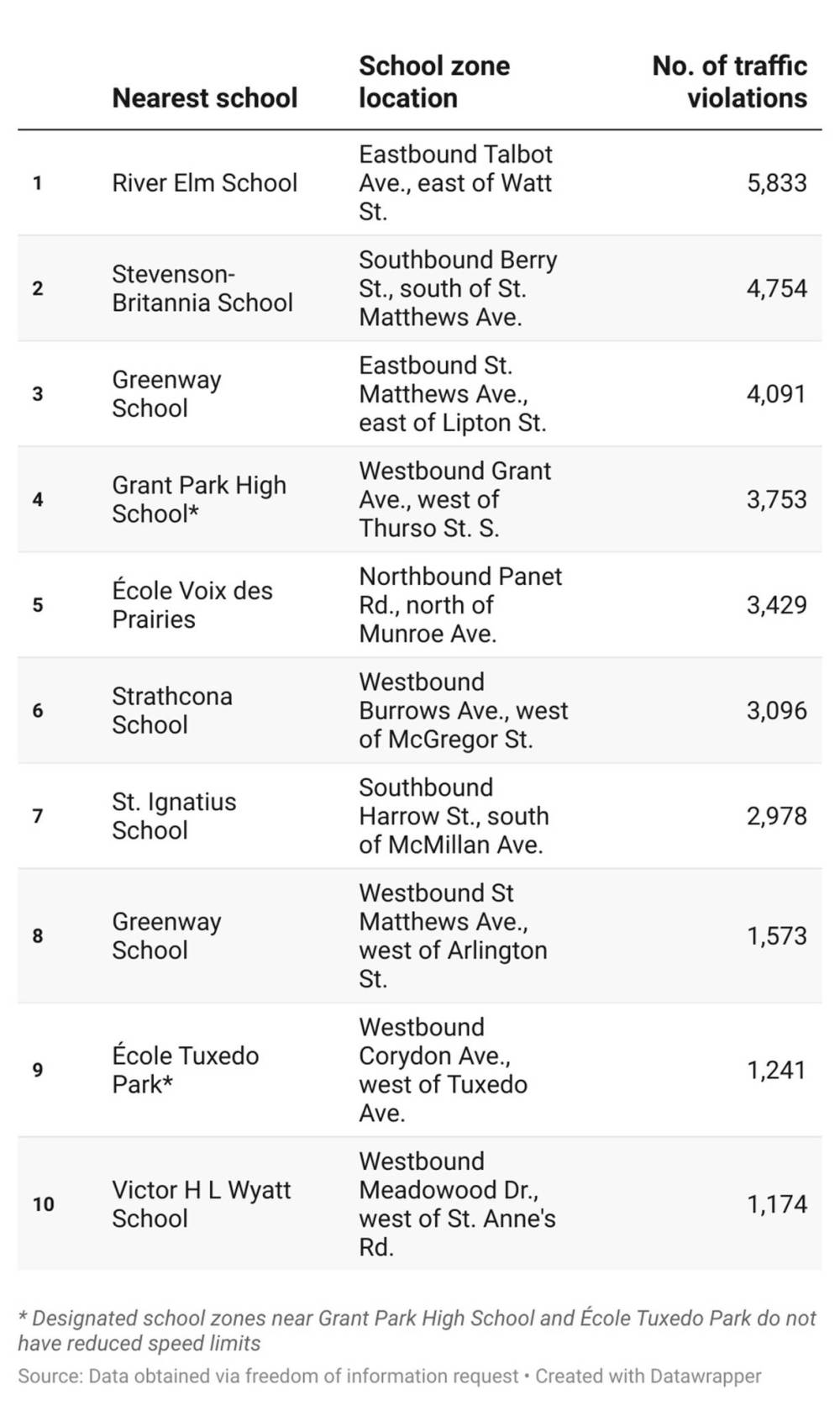 The worst spots — based on infraction data that Pankratz has collected regularly, dating back to September 2014 — include River Elm School, St. Ignatius School, Stevenson-Britannia School, Greenway School and Strathcona School.