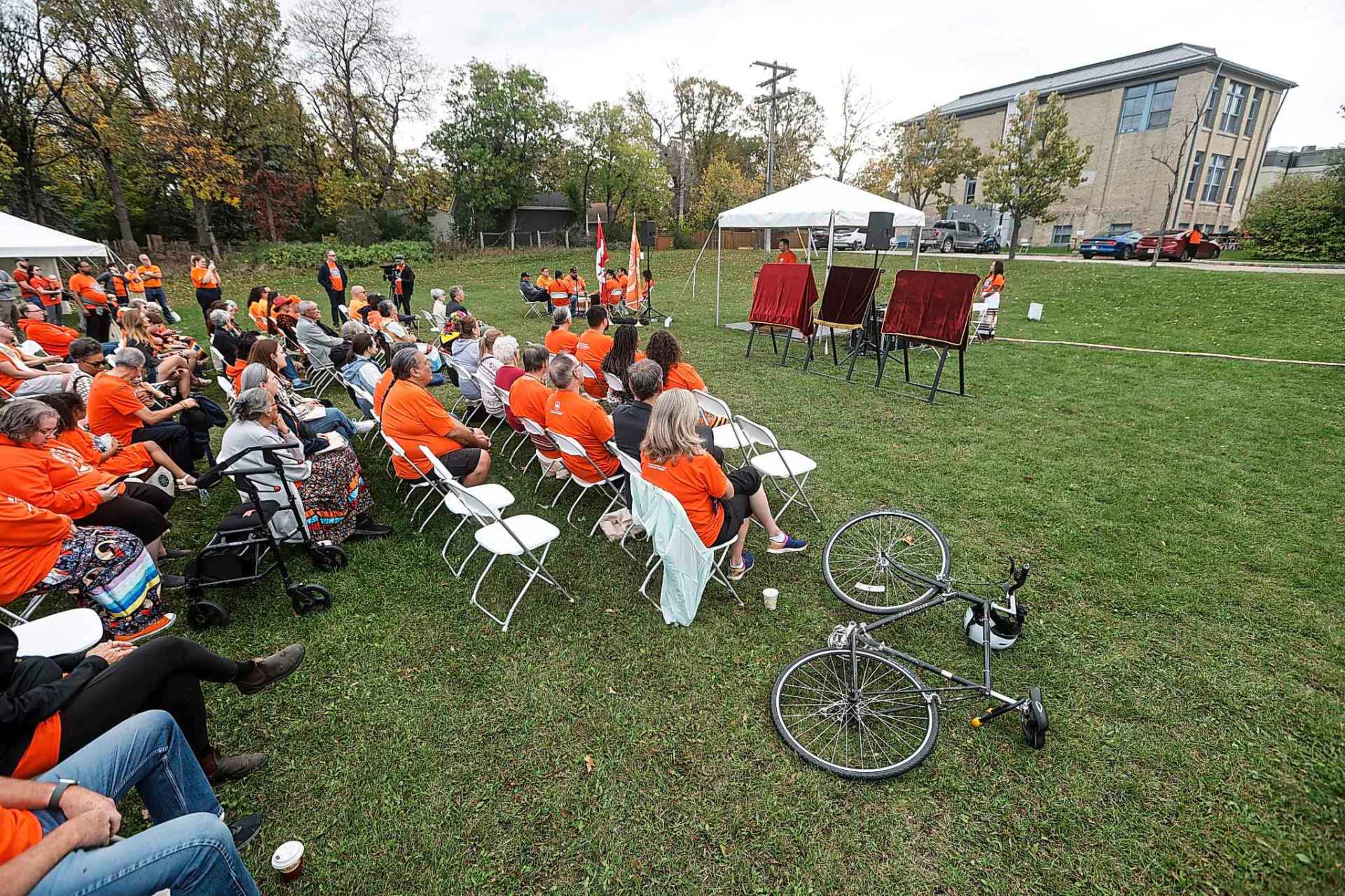 Originally from Ochapowace Cree Nation in Saskatchewan but living in Winnipeg, George is helping her son, Houston, get dressed for the upcoming powwow. For her, seeing so many families coming together to recognize the impact of the residential school system and celebrate Indigenous resilience is touching.