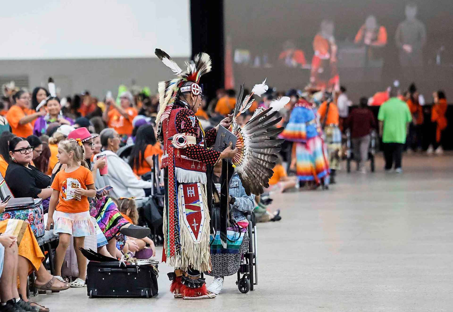 The crowds, many of whom started their day at a morning pipe ceremony and march from Oodena Circle at The Forks to the RBC Convention Centre, filled the centre and surrounding streets. Dancers, many young children, were dressed in regalia and waving flags or eagle sticks.
