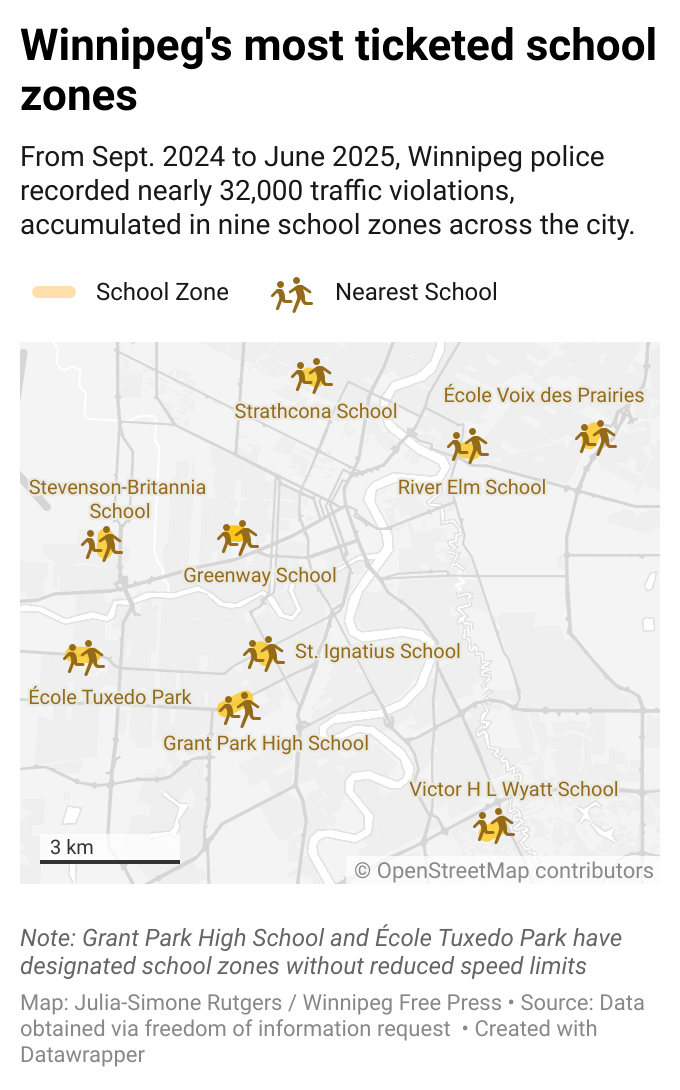 St. Matthews Avenue is the only street that accounted for two distinct spots on the Winnipeg Police Service list of its most-ticketed school zones between Sept. 1, 2024, and June 30.