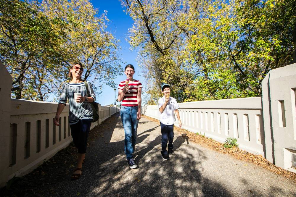 Trish Farkas (left), Maria Farkas Freitas, and Lino Farkas Freitas enjoy an ice cream while walking across the bridge at Assiniboine Park on Thursday.
