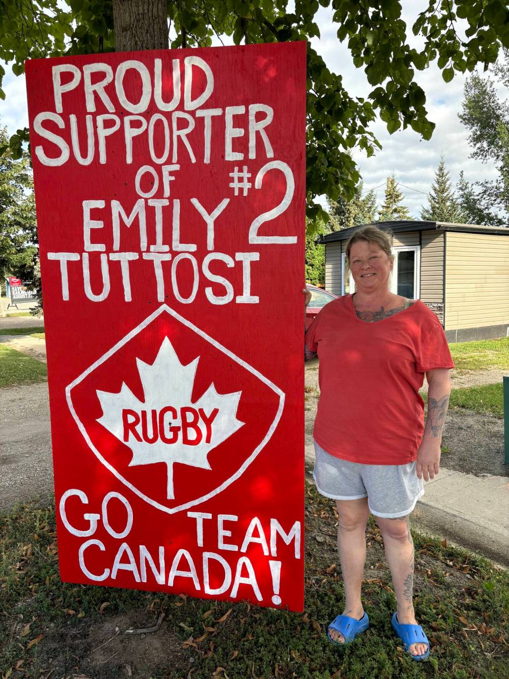SUPPLIED Lorraine McKay, mother of national rugby star Emily Tuttosi, poses with one of her homemade signs in front of her Souris home.