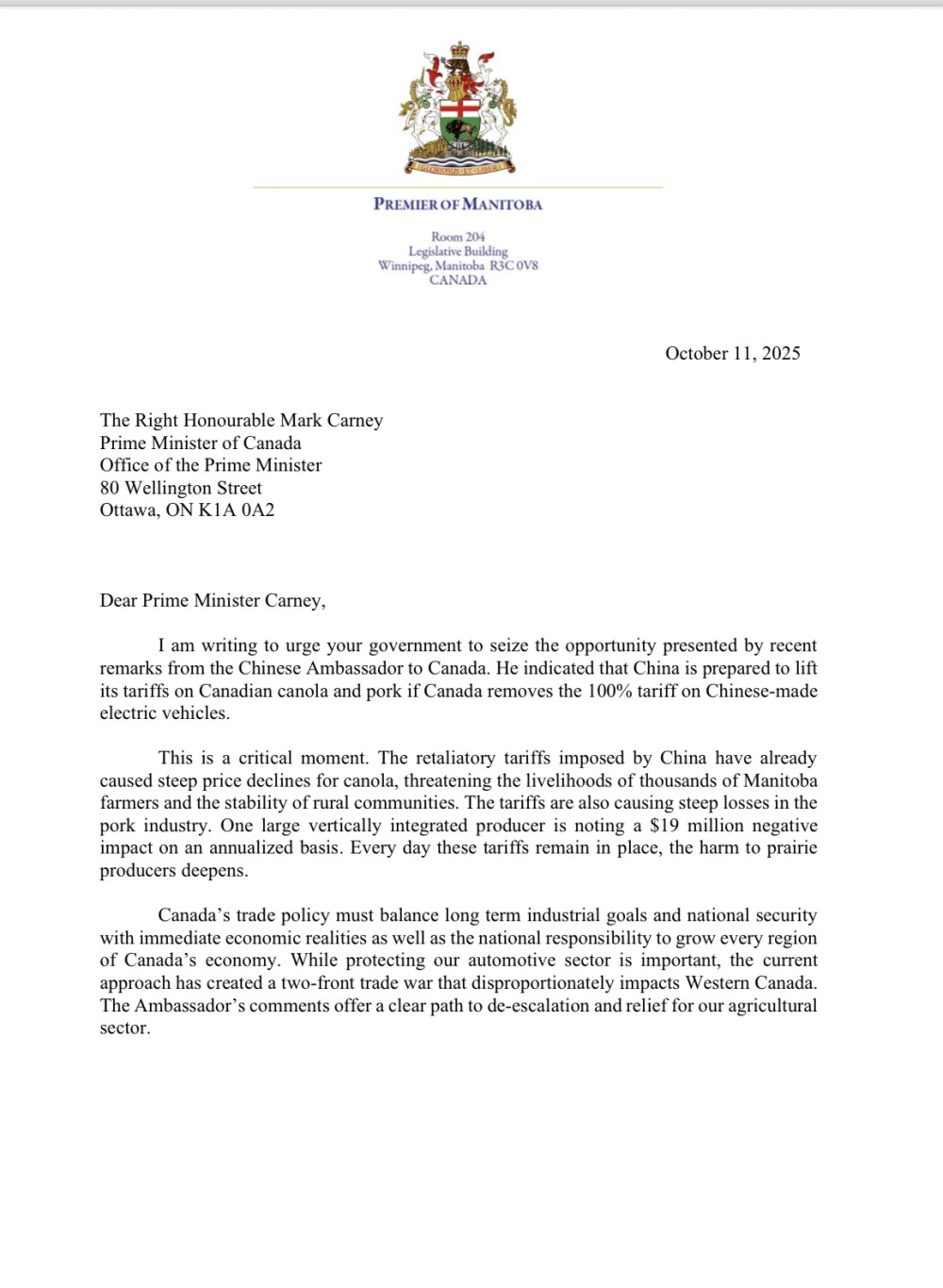 “The retaliatory tariffs imposed by China have already caused steep price declines for canola, threatening the livelihoods of thousands of Manitoba farmers and the stability of rural communities,” the letter states.