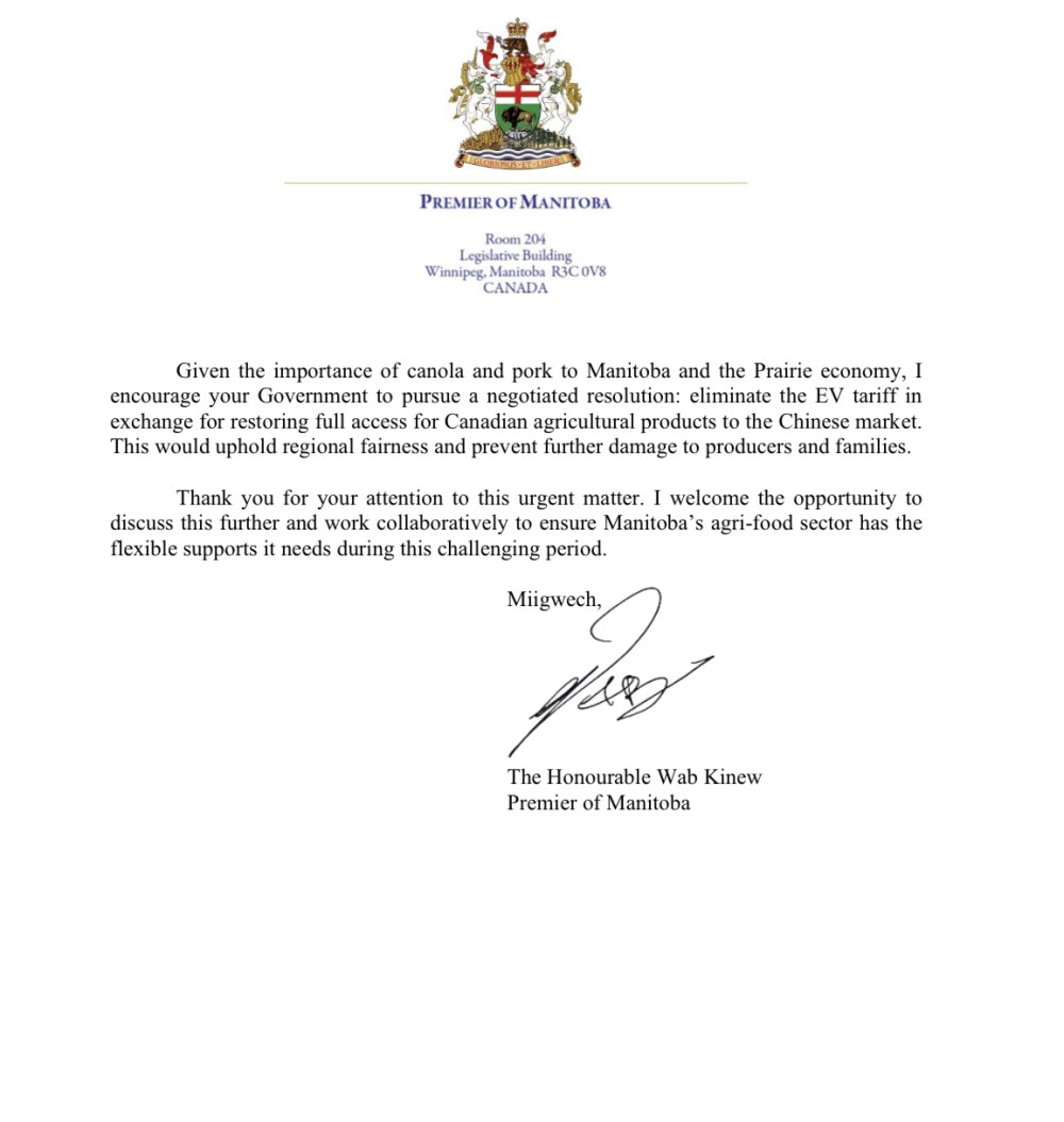 Kinew asked the prime minister eliminate the electric vehicle tariff in exchange for restoring full access for Canadian agricultural products to the Chinese market, which would “uphold regional fairness and prevent further damage to producers and families.”