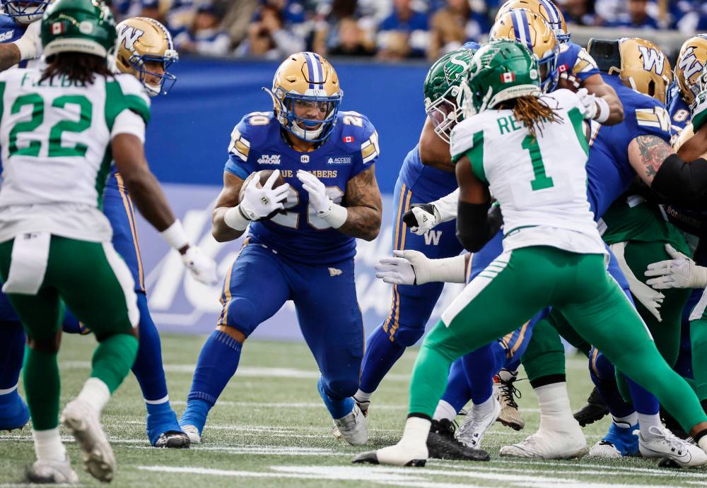 JOHN WOODS / THE CANADIAN PRESS Winnipeg Blue Bombers’ Brady Oliveira (20) runs for the first down against the Saskatchewan Roughriders during first half CFL action in Winnipeg, Saturday, Sept. 6, 2025