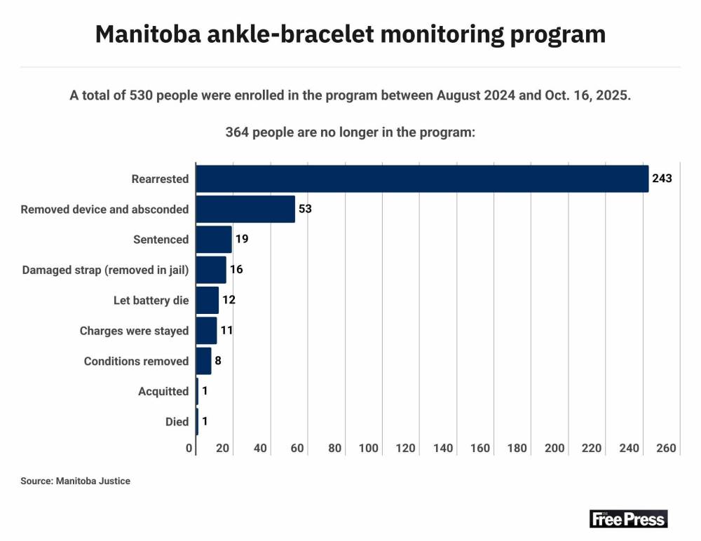 New figures released by the province show 530 people had enrolled in the program as of Oct. 16. Of those, 243 were rearrested for violating conditions or committing new crimes. Another 53 removed their monitors and fled, while 16 people damaged the device and 12 others let the battery die.