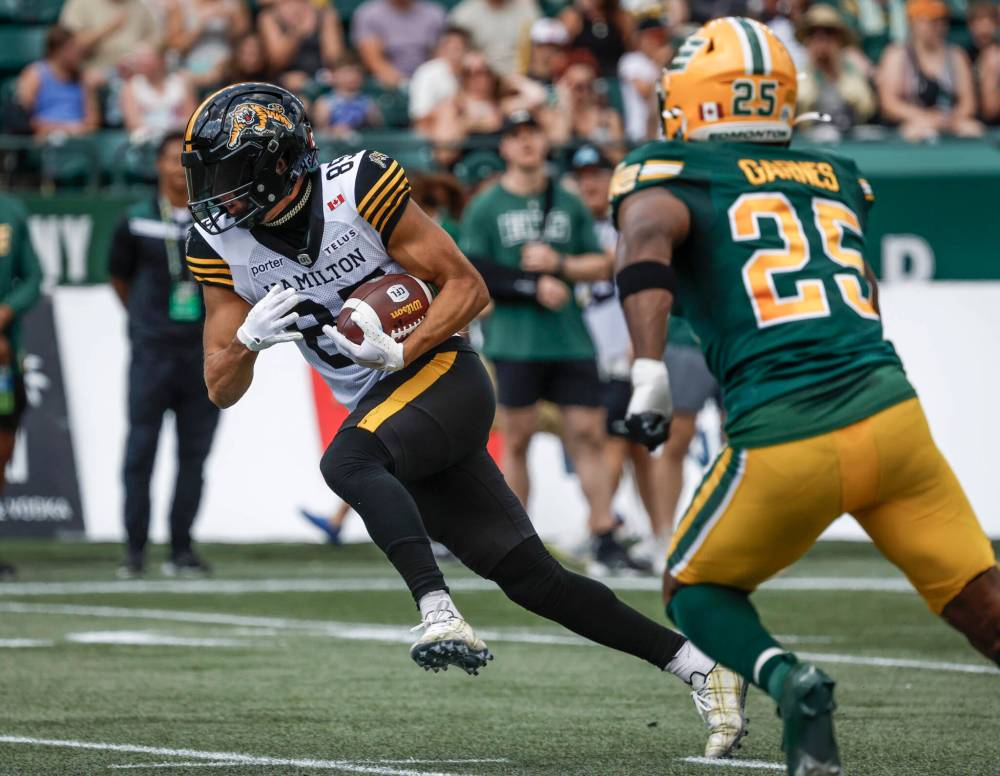 Jeff McIntosh / THE CANADIAN PRESS FILES Hamilton Tiger-Cats’ Kiondré Smith (right) goes for a scamper.