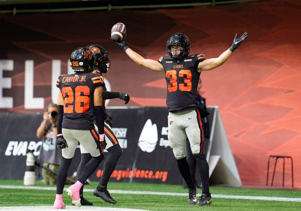 Jeff Vinnick/BC Lions B.C. Lions’ defensive back Jackson Findlay (right) celebrates an interception with his teammates.