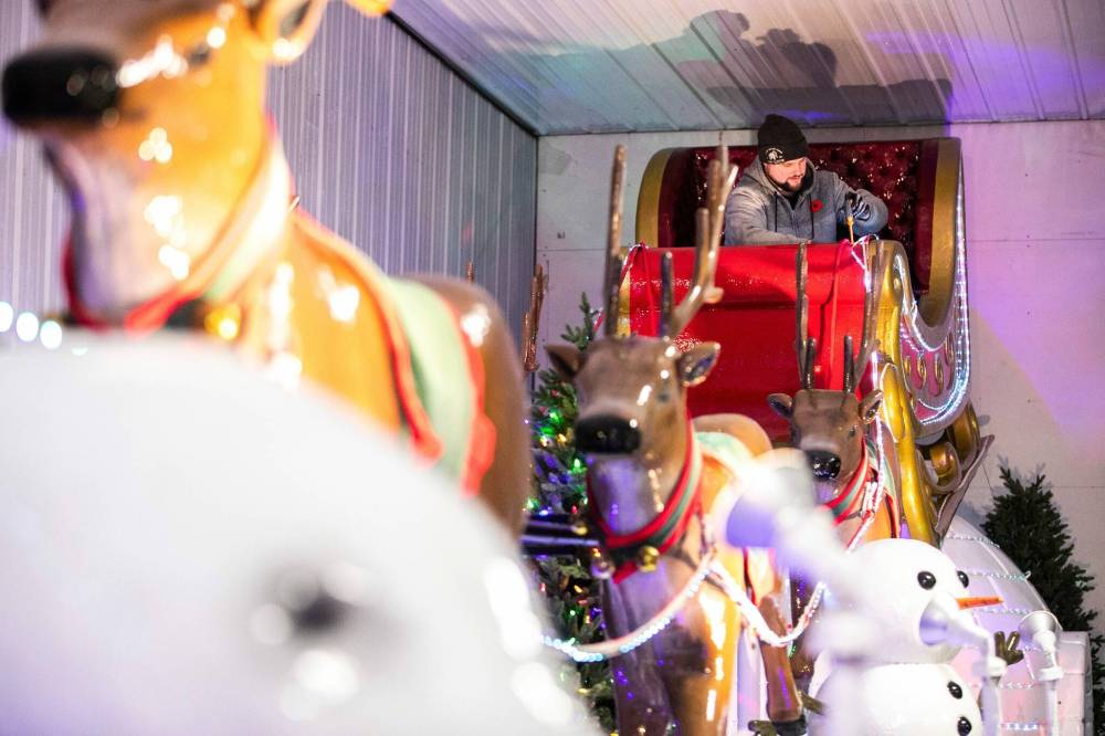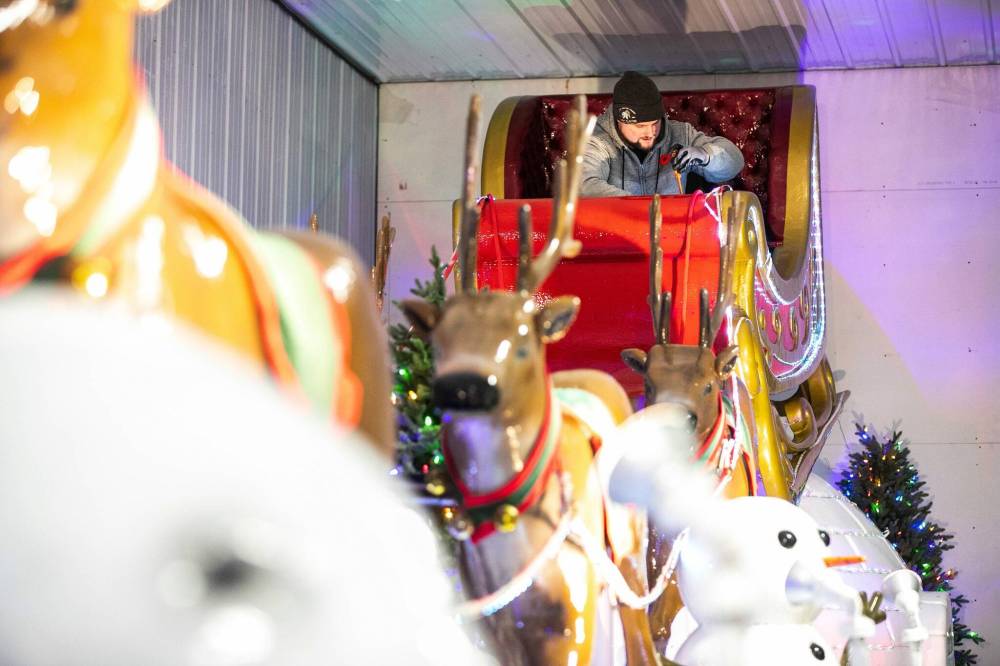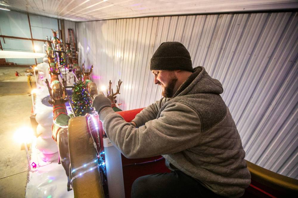 David Walker, electrician with Knight Electric, installs new lights in the sleigh of the Santa float on Monday.