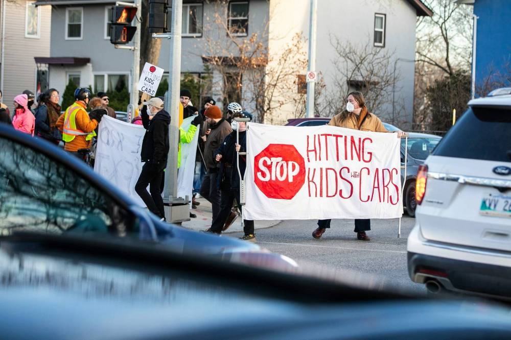 Community members including parents and cyclists hold a rally at the intersection of Osborne Street and Brandon Avenue Thursday where a 10-year-old was struck by a vehicle last week.
