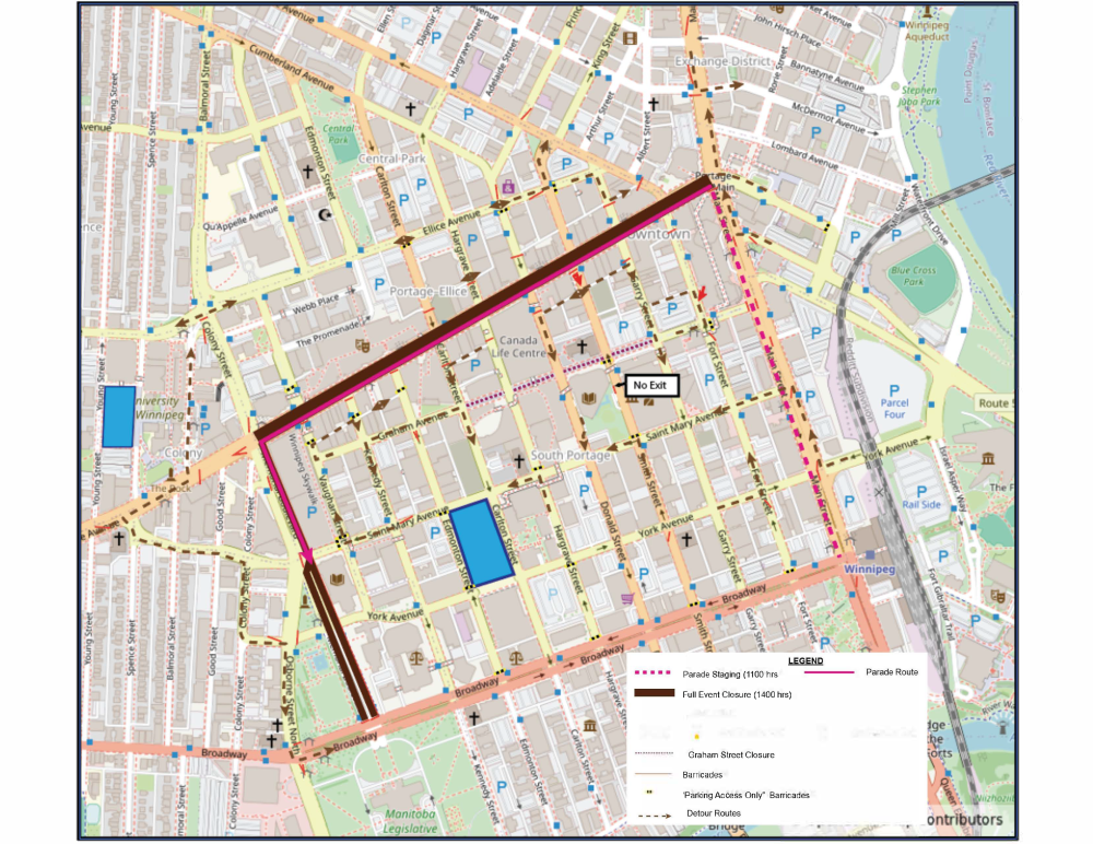 Several streets will be closed from 11 a.m. to 10 p.m. Saturday for the parade. Portage will be closed in both directions from St. Mary Avenue to Main Street. Northbound and southbound cross streets within that area will have limited access to Portage.