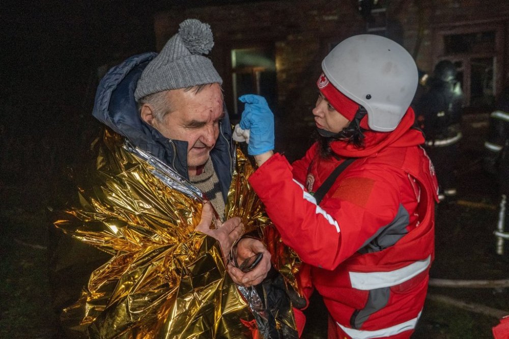 A paramedic gives first aid to a resident who was injured in a Russian airstrike in Kharkiv, Ukraine, late Sunday, Nov. 23, 2025. (AP Photo/Andrii Marienko)