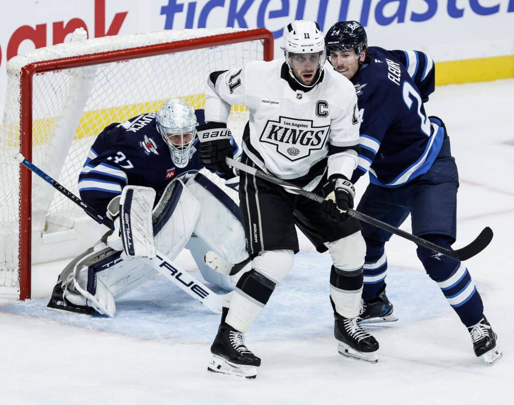 JOHN WOODS / THE CANADIAN PRESS FILES Winnipeg Jets goaltender Connor Hellebuyck looks for the puck as Hadyn Fleury defends against Los Angeles Kings’ Anze Kopitar during a game in Winnipeg in October.