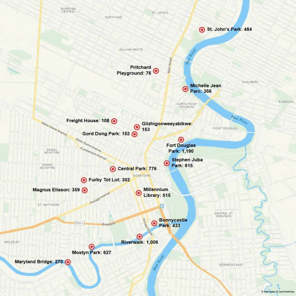 The program includes the Assiniboine Riverwalk, Bonnycastle Park, Central Park, Fort Douglas Park, Freighthouse recreation centre, Furby Tot Lot, Giizhigooweeyabikwe Park, Gord Dong Park, Magnus Eliason recreation centre, Maryland Bridge, Michelle Jean Park, Millennium Library, Mostyn Park, Pritchard Playground, St. John’s Park and Stephen Juba Park.