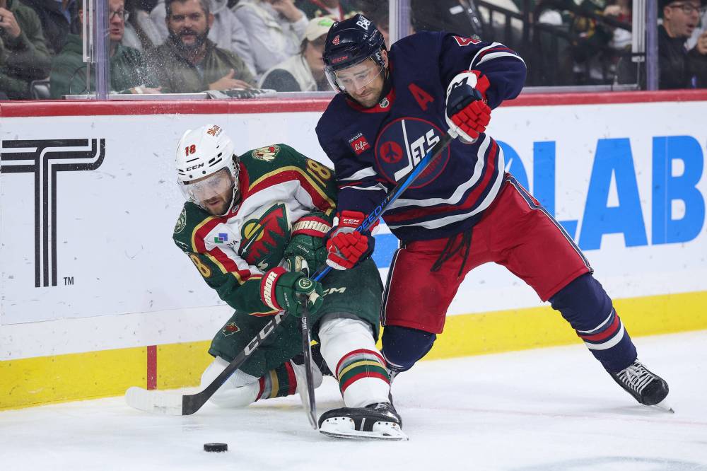 Matt Krohn / THE ASSOCIATED PRESS FILES Winnipeg Jets defenceman Neal Pionk (right) was injured Nov. 23 against the Minnesota Wild, leaving in the first period with a lower-body injury.