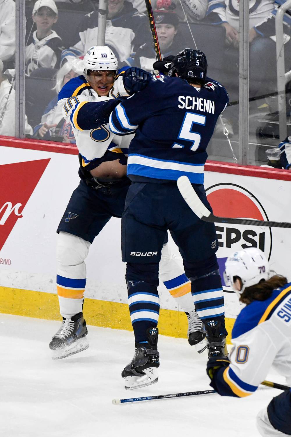 Fred Greenslade / THE CANADIAN PRESS FILES Winnipeg Jets defenceman Luke Schenn (right) said that he and St. Louis Blues captain Brayden Schenn’s (left) father, Jeff, texted them during the first-round, scolding them for their boorish behaviour and telling them to dial it back a few notches.