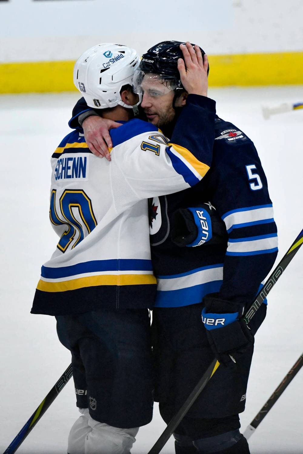 Fred Greenslade / THE CANADIAN PRESS FILES Winnipeg Jets defenceman Luke Schenn (right) said it was strange to not be able to reach out to his brother, St. Louis Blues captain Brayden Schenn (left), during their heated first-round matchup in last year’s playoffs.
