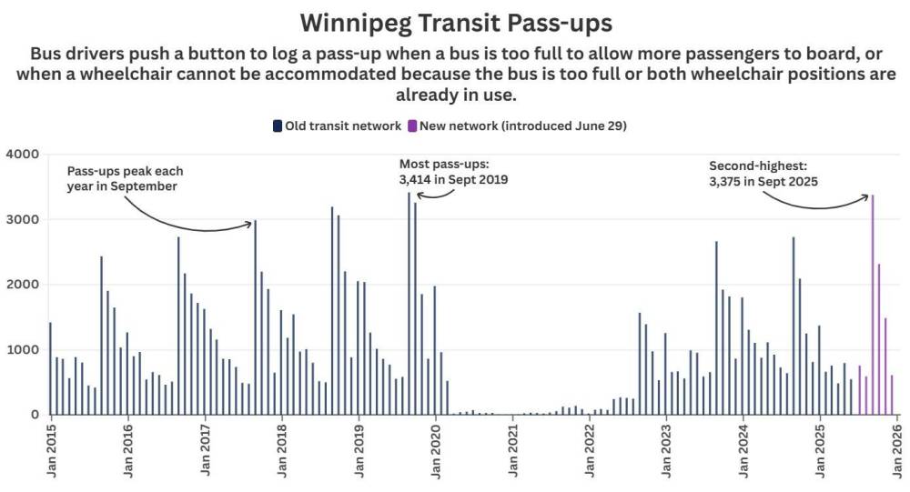 The number of full Winnipeg buses that pass by waiting riders grew this fall. Between September and November, there were 6,971 pass-ups, compared to 5,779 during the same period last year.