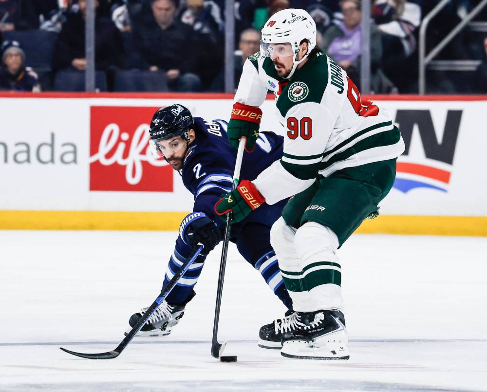 THE CANADIAN PRESS / John Woods Winnipeg Jets’ Dylan DeMelo (2) defends against Minnesota Wild’s Marcus Johansson (90) during second period NHL action in Winnipeg, Saturday, Dec. 27, 2025.