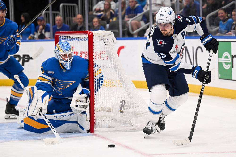 Connor Hamilton / The Associated Press Winnipeg Jets centre Jonathan Toews scored the game-winning goal in the Jets 3-2 win over the St. Louis Blues on Thursday.